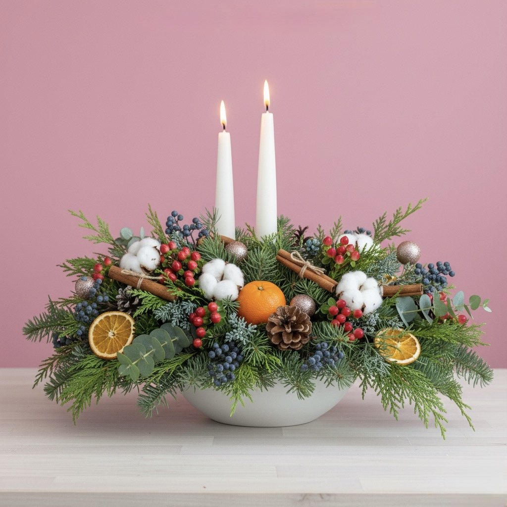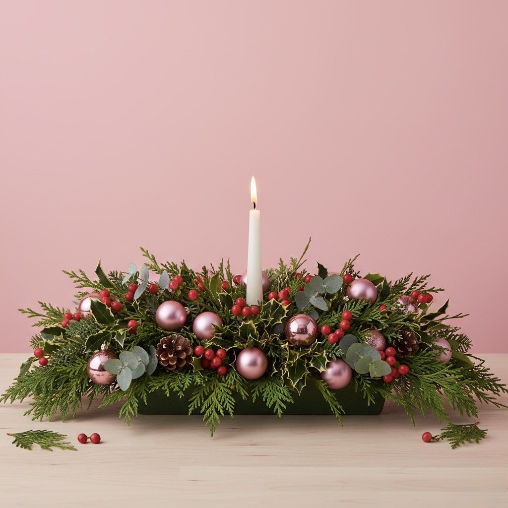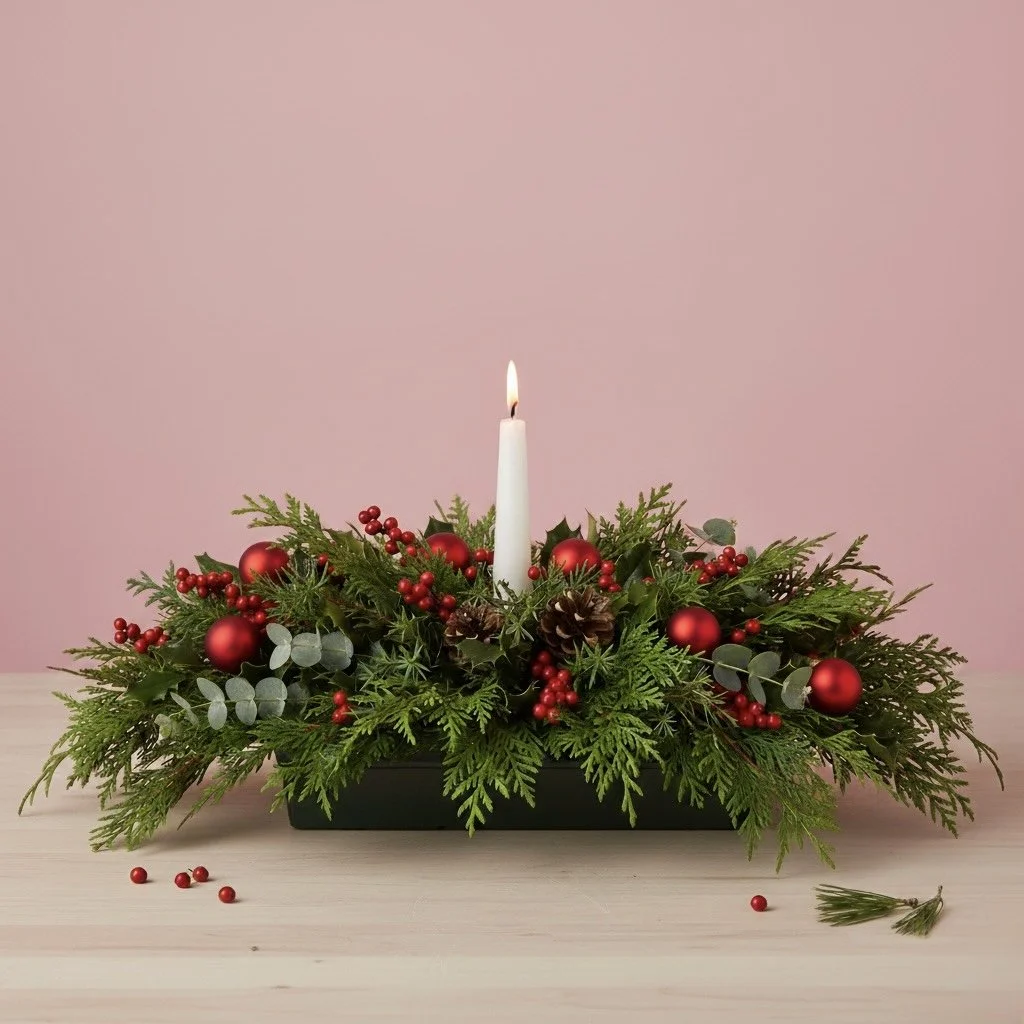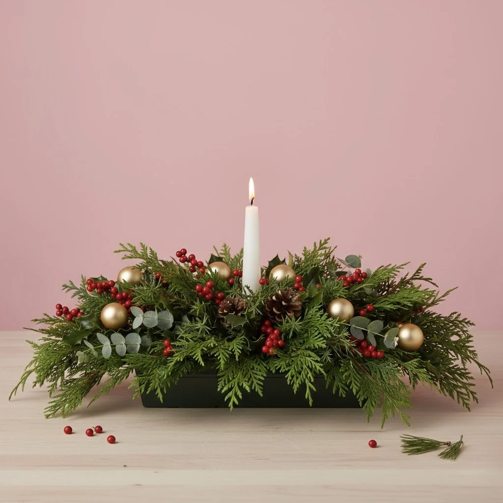 The Holiday Table is our signature festive arrangement, handcrafted with fresh winter greens, berries, and seasonal accents in your choice of gold, red, silver, natural, or pink. Designed to bring warmth and texture to your dining table, coffee table, or sideboard — basically anywhere that needs a touch of holiday magic.